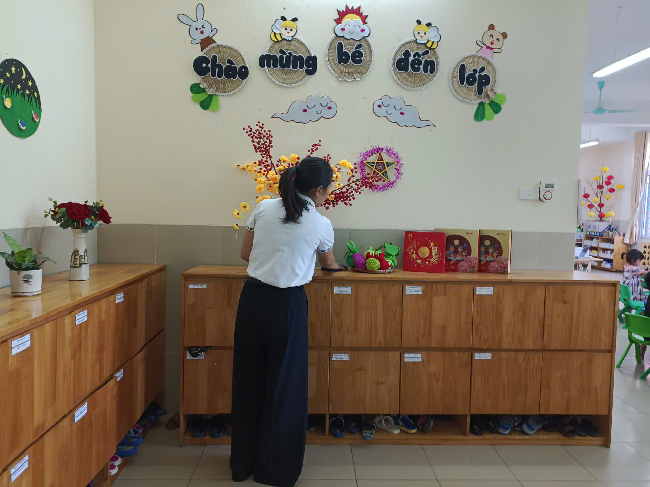 Lao động vệ sinh, cọ rửa bồn cầu nhà vệ sinh, lau đồ dùng đồ chơi, sắp xếp góc chơi là hoạt động thường xuyên của các cô vào thứ sáu hàng tuần là một hoạt động có nề nếp. Lao động vệ sinh nhằm đảm bảo môi trường lớp học luôn sạch sẽ và đảm bảo an toàn về sức khỏe cho trẻ trước khi đến lớp – trong khi học- sau khi ra về.