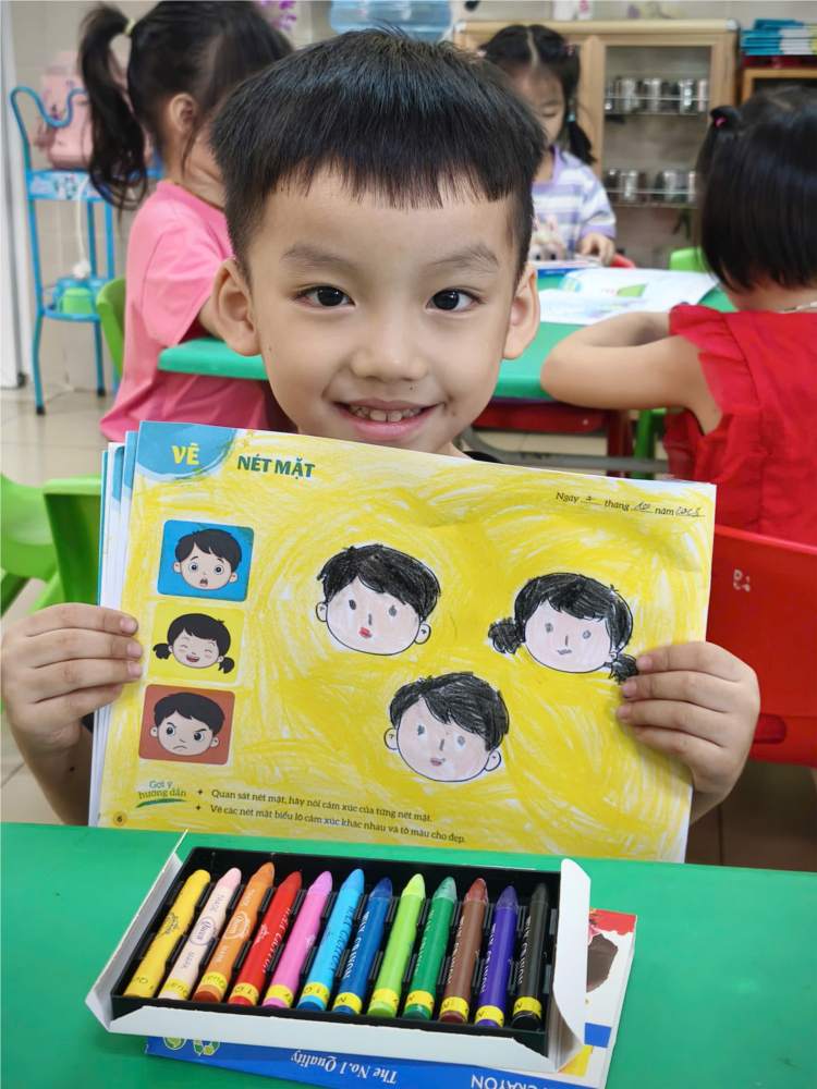 Thông qua hoạt động “Vẽ nét mặt”, phát triển cho các con kĩ năng quan sát, các con nhận biết và nói được cảm xúc của từng nét mặt (ngạc nhiên, vui buồn, tức giận…). Từ đó, các con biết sử dụng các nét vẽ cơ bản để vẽ các nét mặt biểu lộ cảm xúc khác nhau và khéo léo tô màu những khuôn mặt cho thật đẹp!