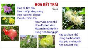 Bài thơ Hoa kết trái Hoa cà tim tím Hoa mướp vàng vàng Hoa lựu chói chang Đỏ như đóm lửa. Hoa vừng nho nhỏ Hoa đỗ xinh xinh Hoa mận trắng tinh Rung rinh trong gió. Này các bạn nhỏ Đừng hái hoa tươi Hoa yêu mọi người Nên hoa kết trái. Tác giả: Thu Hà.